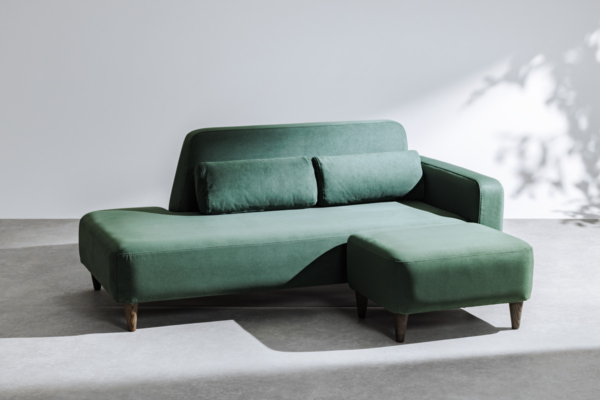 オットマンと腰当てクッションを使うことで、成人男性でも足をのばして横になれるデイベッドに。