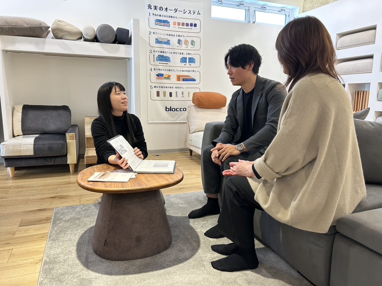 オーダーソファ専門店 blocco旭川では、家具の一大産地として知られる旭川らしく、オーク材を店内のインテリア素材に取り入れ、ナチュラルで明るく落ち着いた空間を演出。